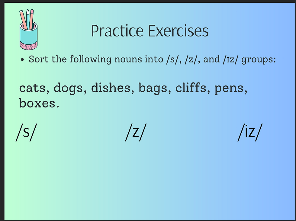 Phonetic Rules - Plural Sounds katemyeJan 12, 20251 min readPhonetic_Rules_Plural_Sounds_ESL.pptx.pdfDownload PDF • 8.58MBBy Kate Ye